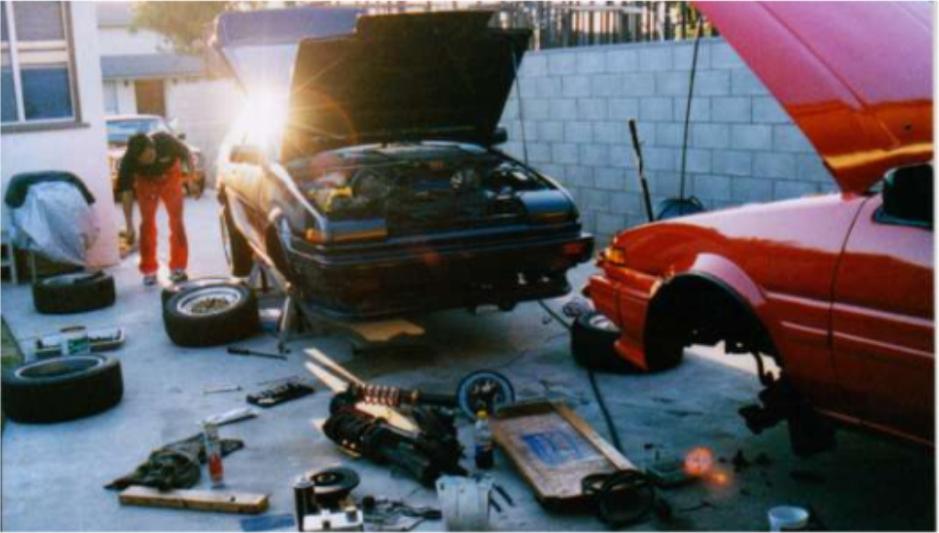 Always at work? on a AE86... Here's me when I'm happiest... Moto-P (me) is the guy in the black T-shirt and smoking cigarettes in half the photos... These taken while transferring suspension to Taka's newly acquired AE86 coupe. Thanks for the pictures Taka...
